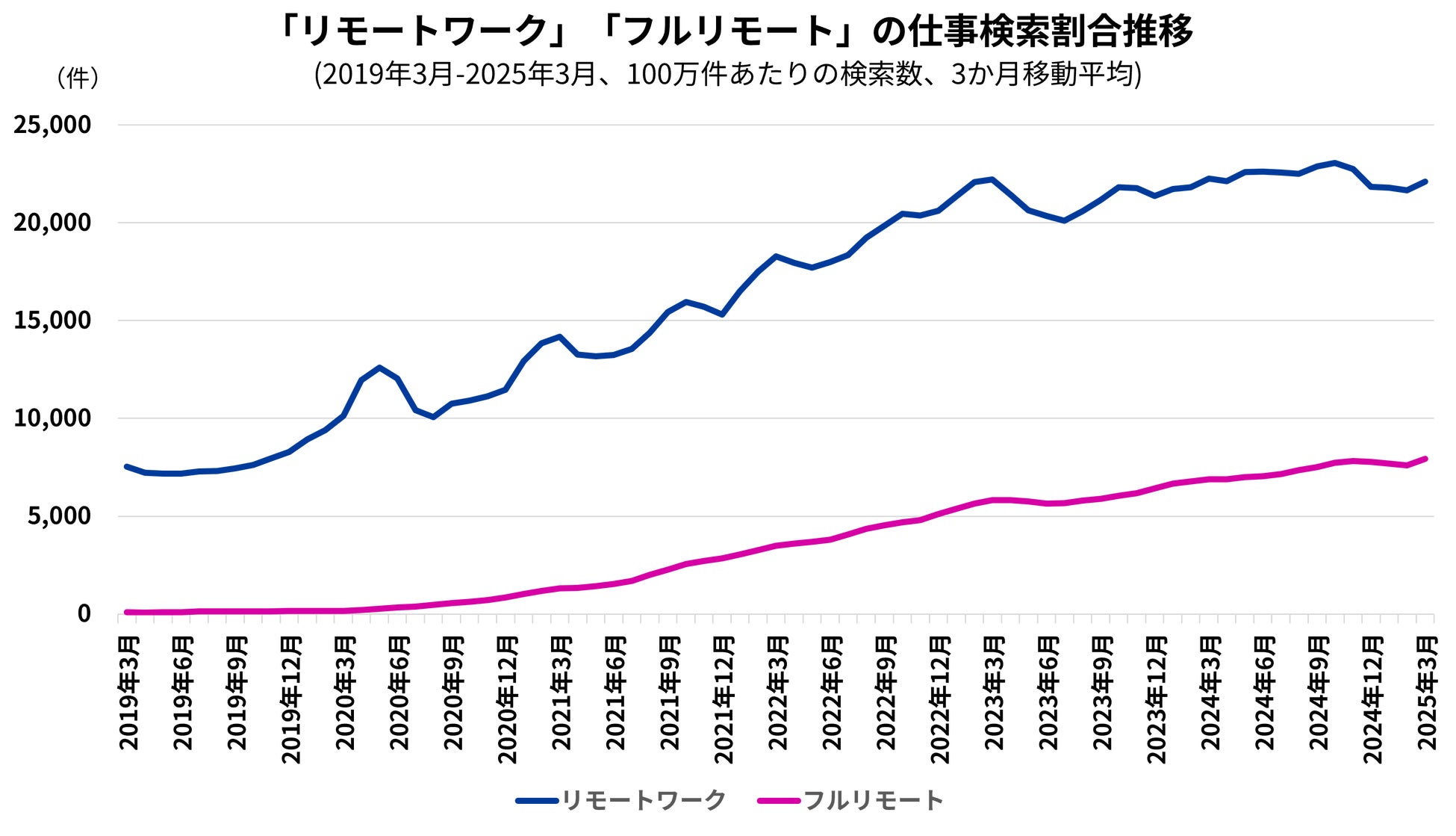 国土交通省の発表**によると、全国の雇用型就業者における直近1年間のテレワーク実施率(2024年10月時点)は15.6%で、コロナ禍で高水準を記録した2021年の21.4%から3年連続で減少しています。また、「勤務先にテレワーク制度がある」と答えた人の割合も3年連続で減少しており、企業の出社回帰が進む状況にあります。こういった企業の動きがある中で、求職者の「リモートワーク」への関心がどのように変化しているのかを明らかにするため、2019年1月から2025年3月までを対象に、 Indeed 上での「リモートワーク」「フルリモート(完全在宅勤務)」の仕事検索動向を調査しました。