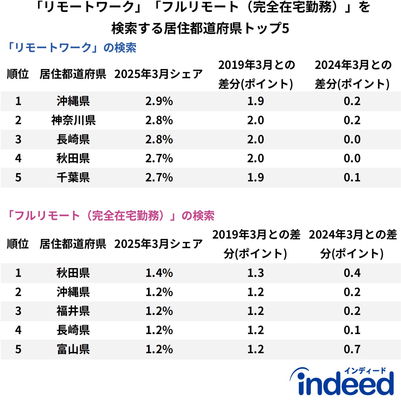 企業の出社回帰が進む中、求職者側のリモートワークに対するニーズは依然として強く、とりわけ「フルリモート(完全在宅勤務)」に対する関心の拡大が注目されます。 Indeed 上の検索データによると、リモートワーク全体の検索は中長期で増加しつつも直近1年間ではほぼ変わりませんが、「フルリモート」の検索は1年前と比べても1.1倍と上昇し続けています。結果として、「フルリモート」がリモートワーク関連検索全体に占める割合は、2020年3月の1.7%から2025年3月には35.9%にまで上昇しています。これは、労働者が単に「柔軟な働き方」を求めているだけではなく、長時間通勤や居住コストなどに対する価値観も経年を通じて変化し、地理的制約から解放された本格的な在宅勤務を魅力的な条件として強く認識していることを意味します。検索した求職者の居住都道府県を確認すると、「フルリモート」では首都圏からより離れた場所で検索割合が高く、かつ上昇していることがわかります。地方在住者・移住者や育児・介護中の労働者など、従来は就業機会が限定されていた層を労働市場に取り込む上でも、フルリモート勤務の整備は、採用企業にとって有効な人材獲得手段となりうるでしょう。