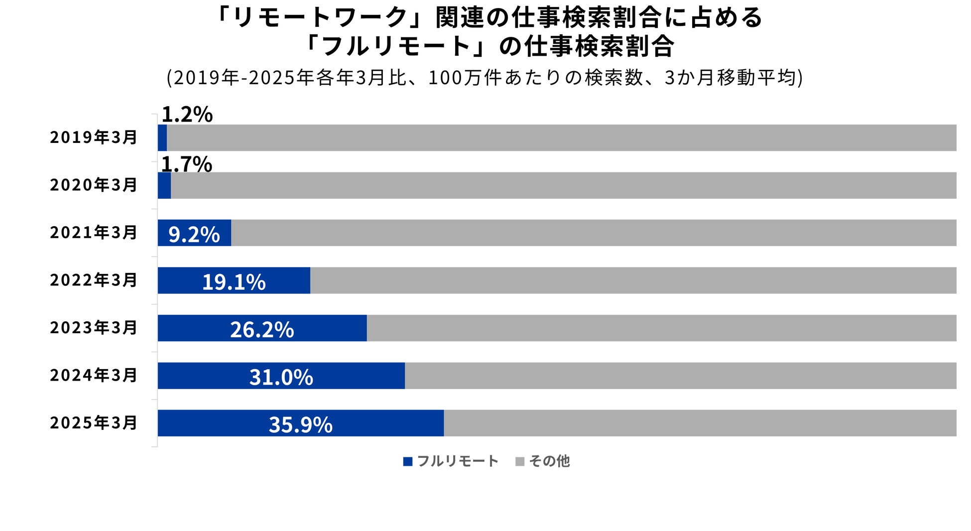 リモートワーク関連の仕事検索全体に占める、「フルリモート」の仕事検索割合を時系列で確認すると、年々増加していることがわかります。コロナ禍初期の2020年3月時点では「フルリモート」が占める割合は1.7%でしたが、2025年3月には35.9%にまで拡大しています。