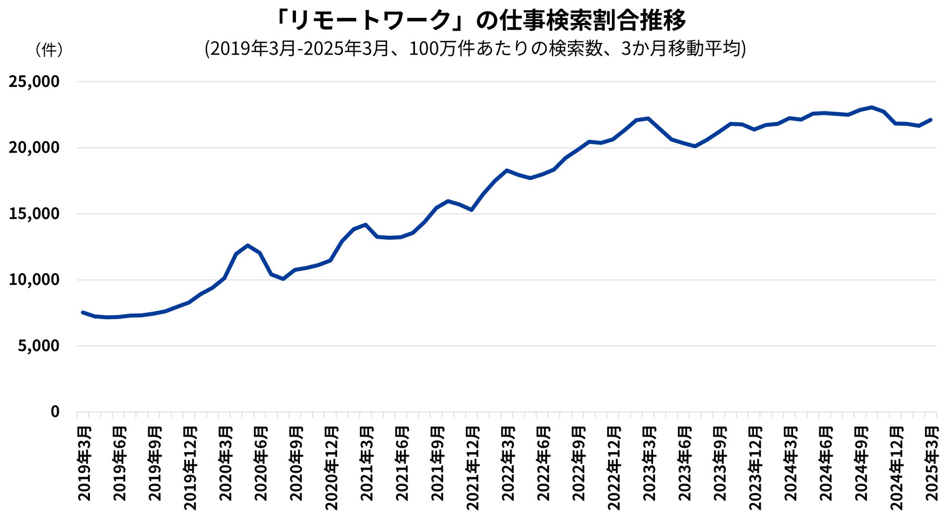 近年、大手企業を中心に原則出社を推奨する動きが報道されるなど、出社回帰の傾向が見られる中、求職者がどのような働き方を希望して仕事を探しているのかを明らかにするため、 Indeed 上での仕事検索データを分析しました。