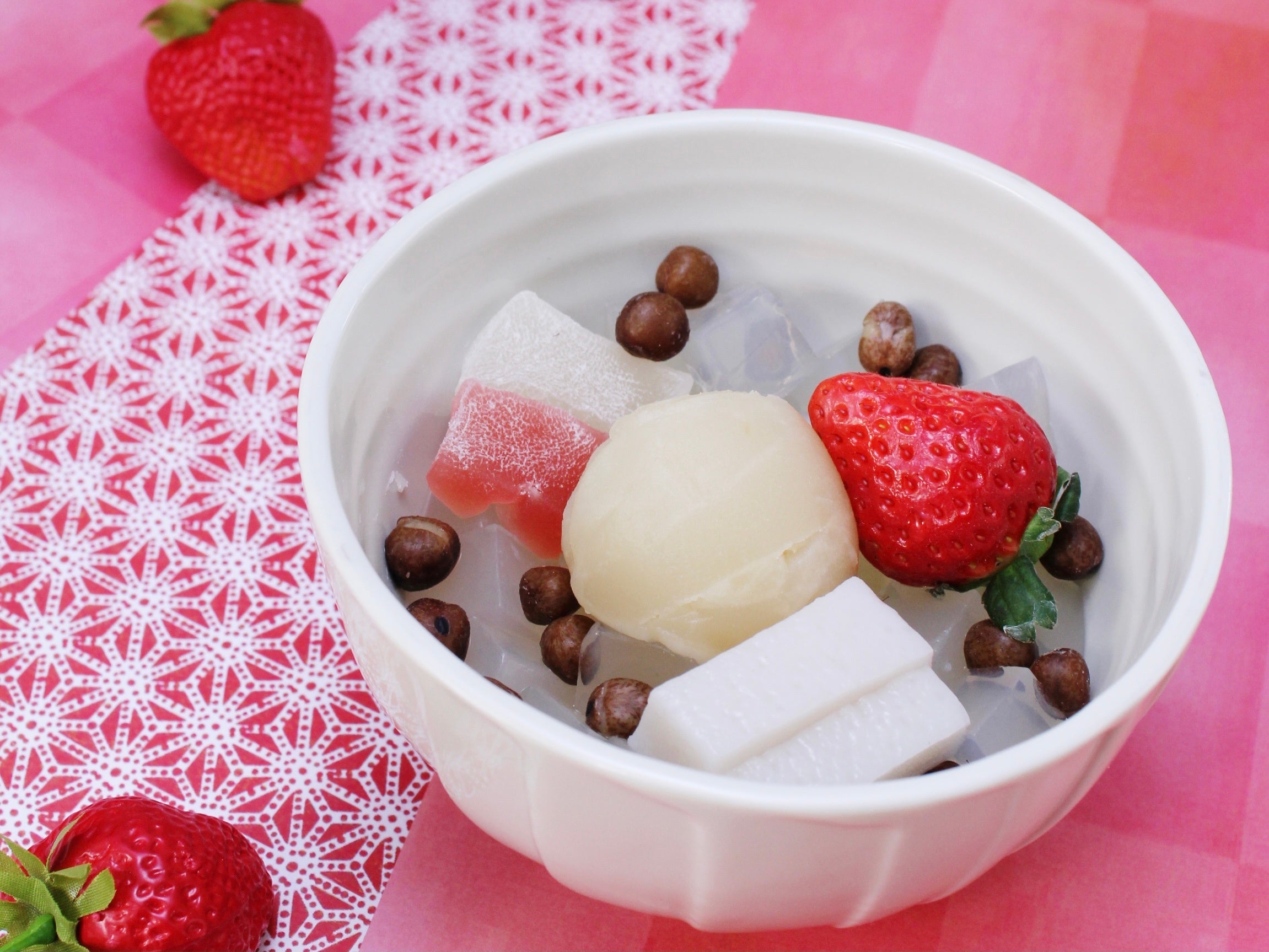 内容: 寒天、赤えんどう豆、ミルク餡、苺、くず餅、ぎゅうひ(ピンクと白)