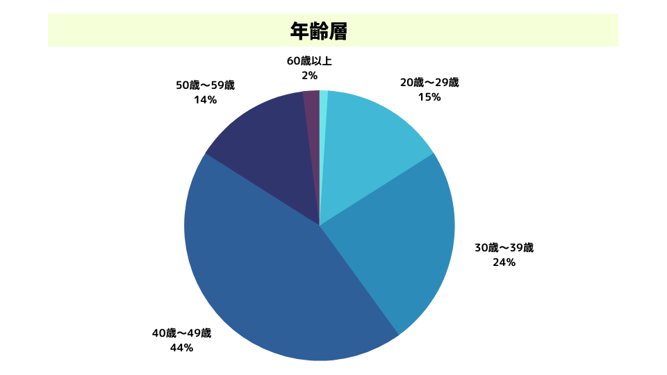 回答者の年齢層は40歳〜49歳が最も多く44%、次に30歳〜39歳が多く、24.0%という結果になりました。