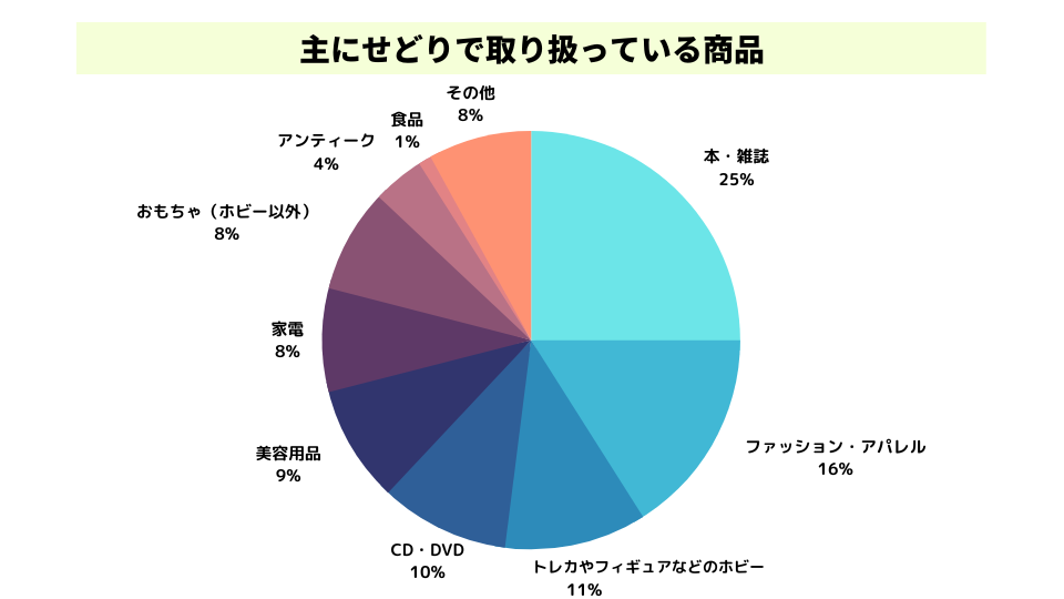 本・雑誌を主にせどりで取引していると答えた人が25.0%、ファッション・アパレルを主にせどりで取引していると答えた人が次に多く16%という結果になりました。