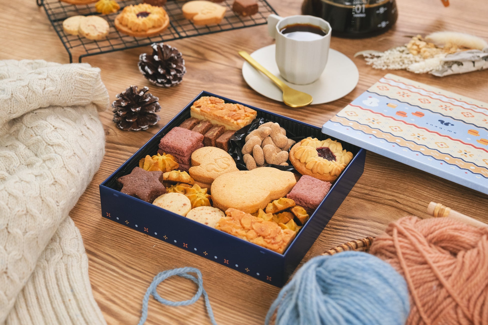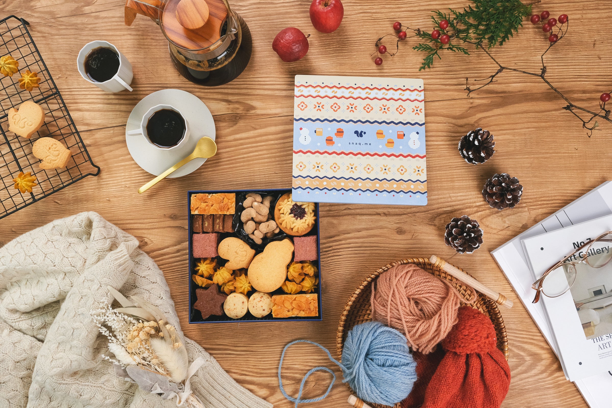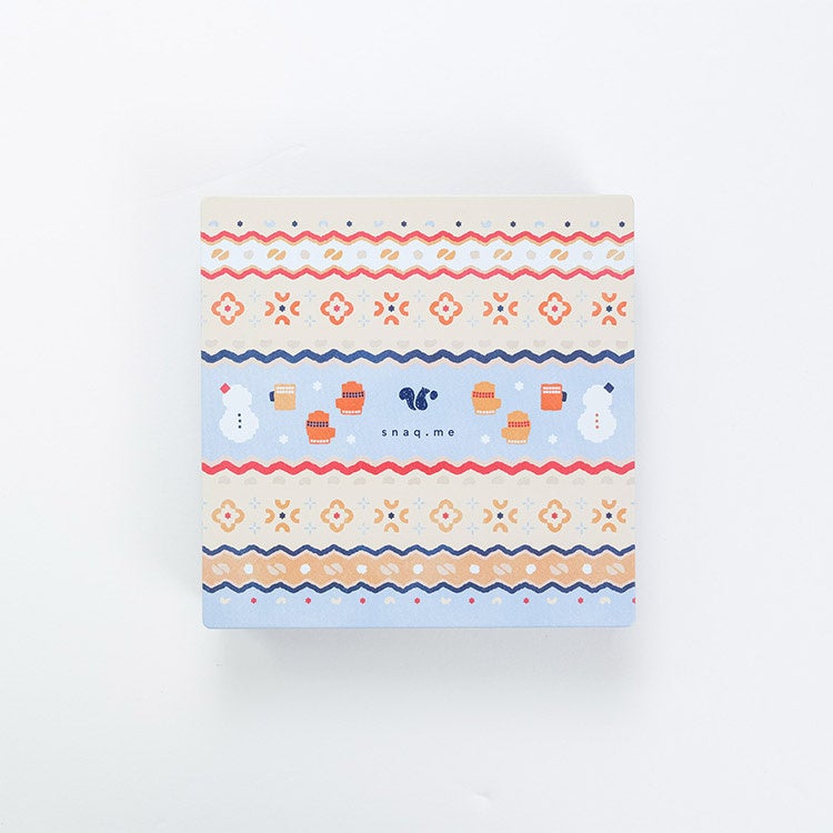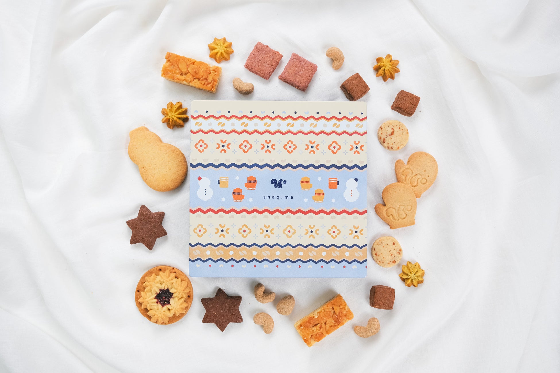 昨冬のクッキー缶は雪景色デザインだったので、今回はがらっと雰囲気を変えてスナックミーらしいニット柄に。華やかな冬らしさが出るよう、色味と模様を細かく調整しました。よ~く見ると、すべておやつのシルエットで構成されているんです。同じ模様でも、少しずつ変化を出して手編みニット感を出しているのがポイントです。キラッと光る雪の模様がいいアクセントになりました。