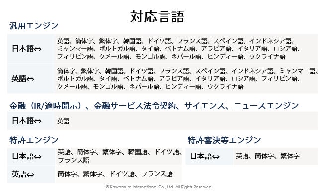 利用可能な翻訳エンジン:汎用/特許/特許審決等/金融(IR/適時開示)/金融サービス/法令契約 /サイエンス/ニュース 8つ全てのエンジン