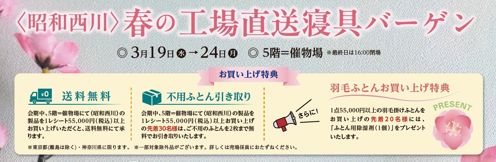 ①昭和西川商品を1レシート55,000円(税込)以上お買上げで送料無料、先着30名はご不要のふとん2枚まで無料にてお引き取りいたします。