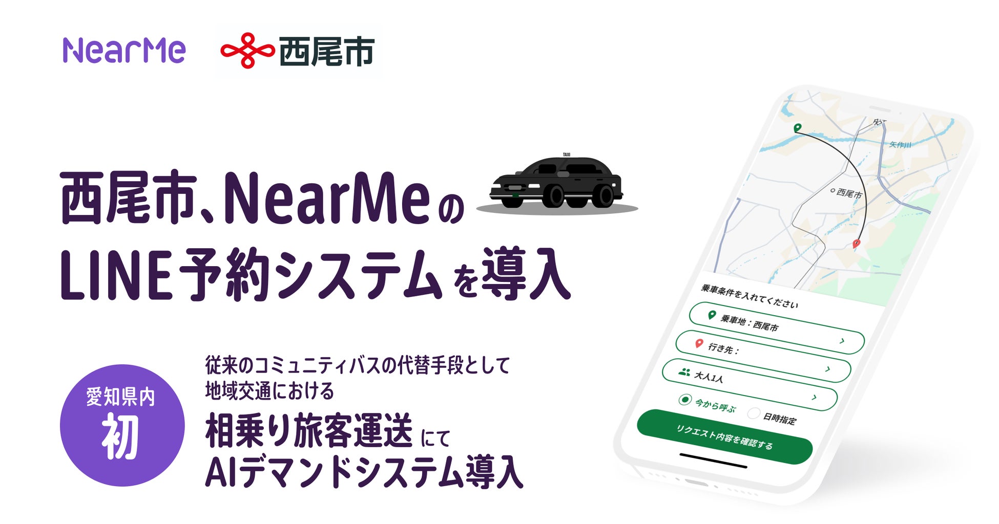 愛知県西尾市では、利用者数の減少によりコミュニティバス「いっちゃんバス」の廃止が決定しており、それに代わる移動手段として「相乗りタクシー」の運行が決定。その「相乗りタクシー」の予約システムとして、ニアミーが開発した「LINEを活用した予約システム」が愛知県初の地域交通における一般乗用旅客自動車運送事業の相乗り旅客運送におけるAIデマンドシステムとして採用されました。