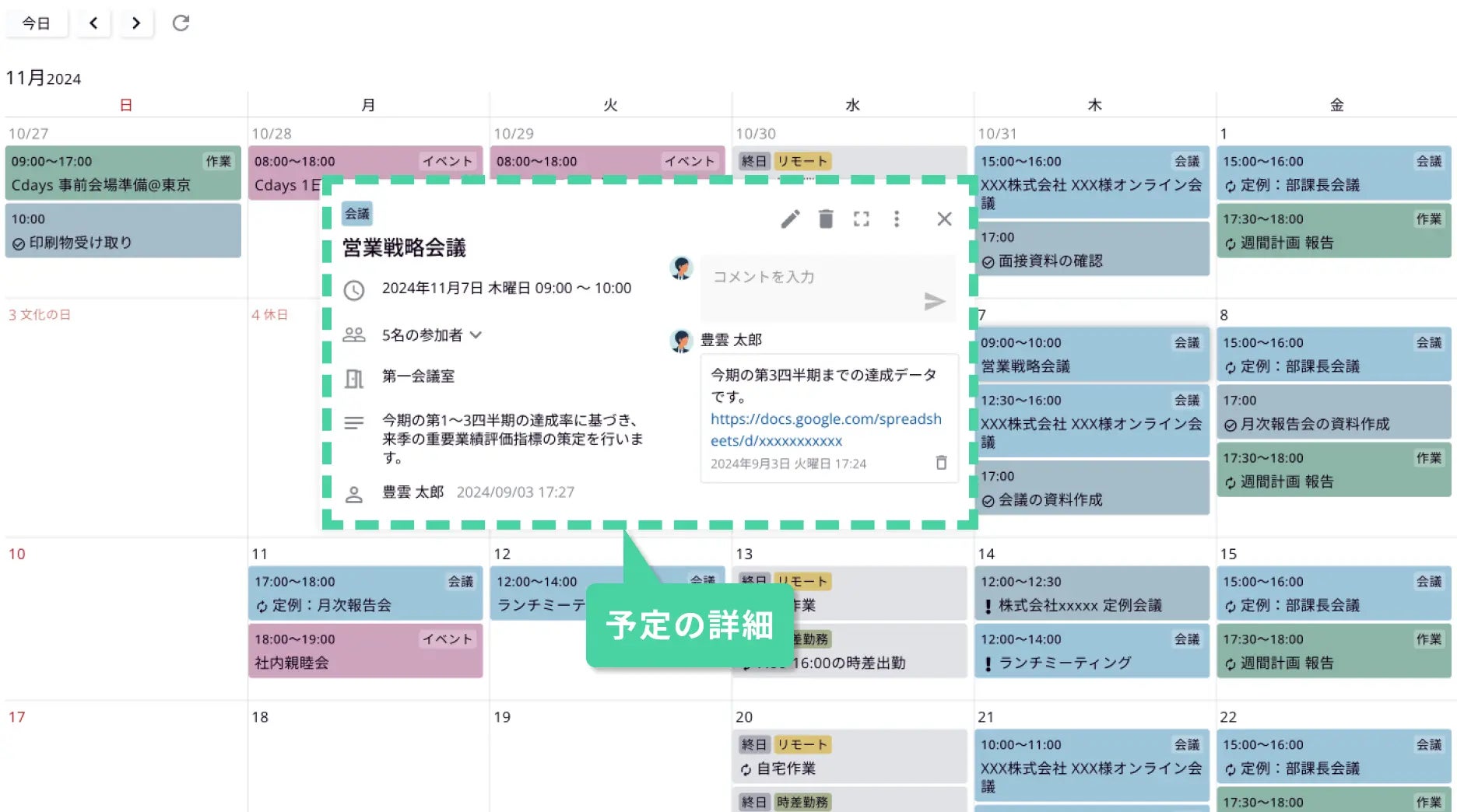 多様な働き方が進む現代においてメンバーがどこにいても、グループ全体の予定がグラフィカルなカレンダー上で一目で把握可能になり、複数メンバーや施設・共有備品の予定をわずか数クリックで登録・変更できます。これにより、社内外のあらゆる予定の調整や管理に関連する業務の効率を飛躍的に向上させます。