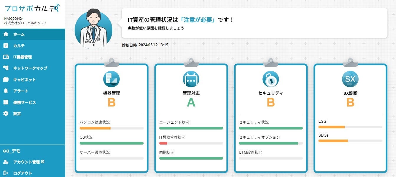 「プロサポカルテ」を用いて、PCやネットワークの状態をリアルタイムに監視し、レポートを作成することで、ネットワーク時代のオフィスにおける管理作業工数の大幅削減と、企業における情報システム管理をサポートしてまいりましたが、近年の企業経営において不可欠であるSDGsやESGへの取り組みと、その可視化に深い知見をもつグローバルキャストのノウハウを活かした可視化サービス「SXサーベイLITE」を連動させることで、企業におけるあらゆる情報の可視化・一元管理に寄与するものとして、この度のサービス連携が実現いたしました。