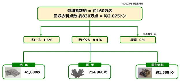 オンワードグループのサステナブル経営推進の一環として、ご愛用いただいた自社の衣料品を回収し、リユース・リサイクルを通じて、衣料品循環システムの構築を目指す取り組みです。2009年にスタートし、2024年度上期までで、累計約160万名のお客さまから約830万点の衣料品を回収しました。