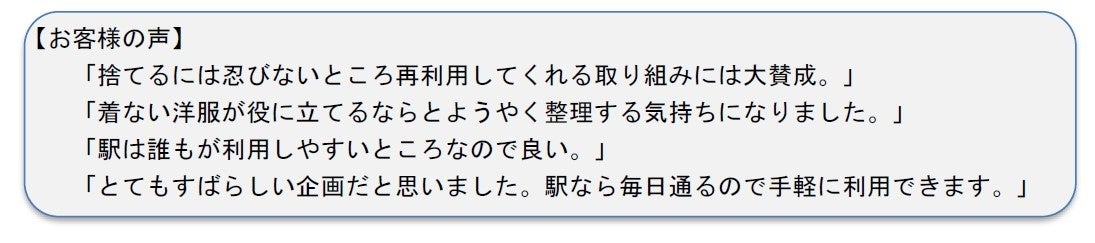 当初の想定をはるかに超える数量の衣服を回収し、駅ならではの利便性と地域の皆さまのSDGsへの関心の高さが現れた結果となりました。また、衣服をご提供いただいたお客さまからは、今回の取り組みに対し、好意的なご意見を多数いただきました。