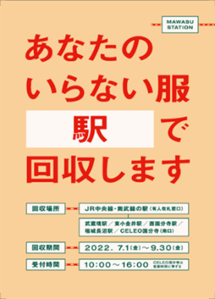 回収場所:JR中央線/武蔵境駅、東小金井駅・西国分寺駅、JR南武線/稲城長沼駅、セレオ国分寺