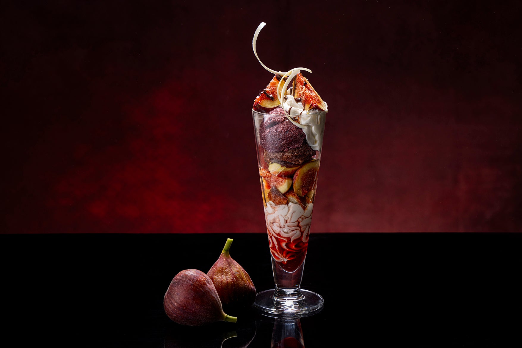 フレッシュ無花果を1個以上使用する「フィグ・エ・ショコラ」は、瑞々しい無花果の甘さを味わいながらカシスの酸味とチョコレートのほのかな苦みが心地よい余韻を残すロングパフェです。カシスゼリー、紅茶のフィナンシェ、チョコレート・カシスアイスクリームが層をなし、塩キャラメリゼした胡桃がパフェの味わいに深みを醸し出します。「エスプレッソマティーニ」や「オールドファッション」などのクラシカルカクテルや「ホットバタードラム」などのホットカクテルを味わいながら、深まる秋を感じるひと時はいかがでしょうか。