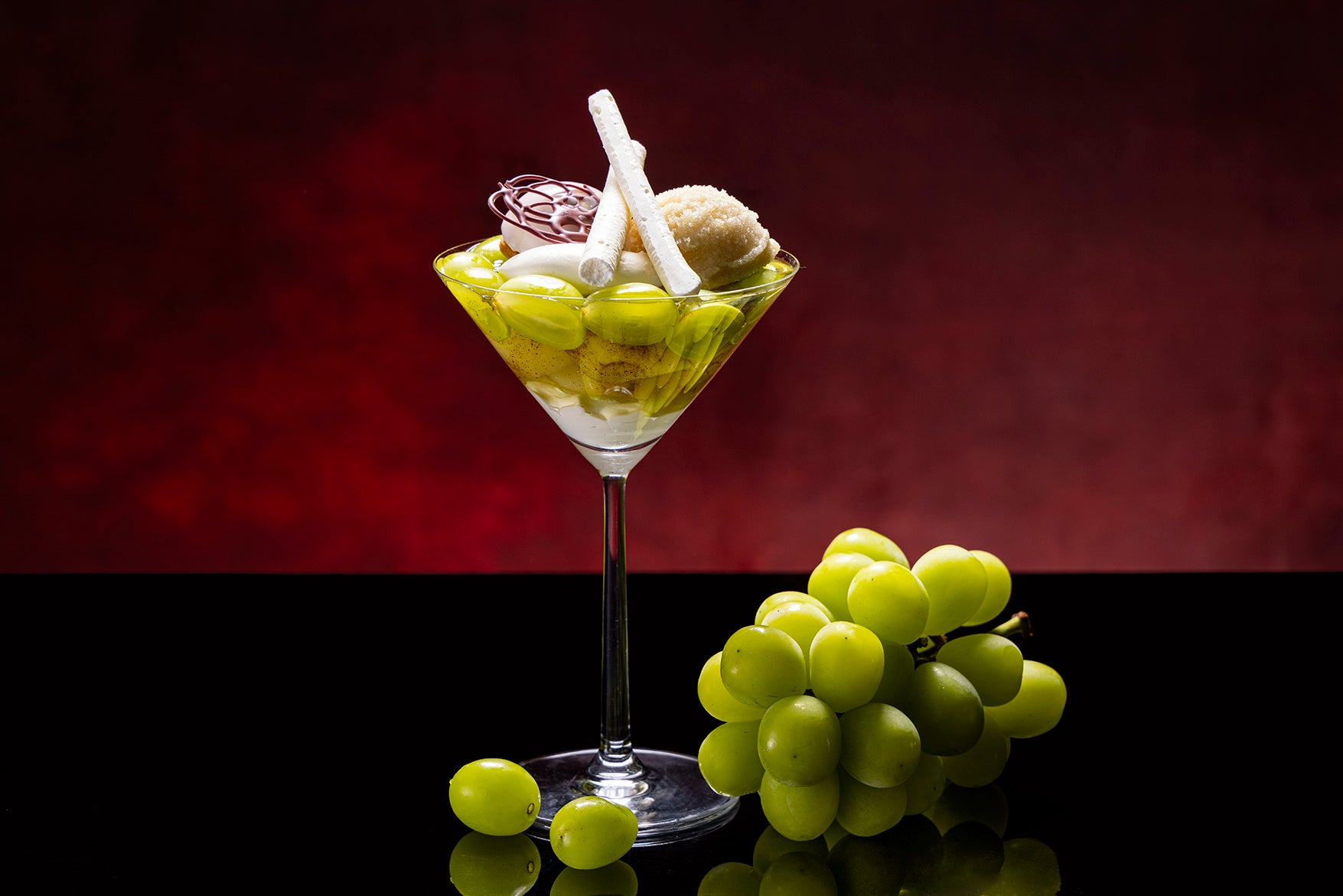 シャインマスカットと貴腐ワインのジュレの組み合わせがエレガントな「ミュスカ・アペラシオン」はバニラでマリネした洋梨やフランスの秋の味覚ミラベルにベルガモットを利かせたムース、フロマージュブランなどが配された爽やかな秋風を感じさせるようなパフェに仕上げました。カクテルグラスを彩る美しい黄緑色の「ミュスカ・アペラシオン」は、シャンパンカクテルや「風と共に去りぬ」の主人公、スカーレット・オハラをイメージして誕生したカクテル「スカーレット・オハラ」などとの相性抜群です。