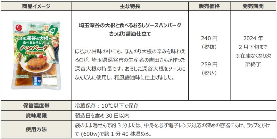 『埼玉深谷の大根と食べるおろしソースハンバーグ さっぱり醤油仕立て』は、まろやかな甘みのなかにほんのり大根の辛みを味わえる深谷大根の特長を活かすために大根おろしをソースに使用し、醤油味に仕上げました。ソースまで余すことなく味わっていただけるハンバーグです。深谷大根の生産者である吉田旭さんからは「作り手の顔が見える商品のため、多くの人に自分が丹精込めて育てた深谷大根を知り、食べてもらえることにやりがいを感じている」とのお声をいただいております。また、商品パッケージにはハンバーグの盛り付け画像を載せることで食べたくなるような商品をイメージして仕上げております。