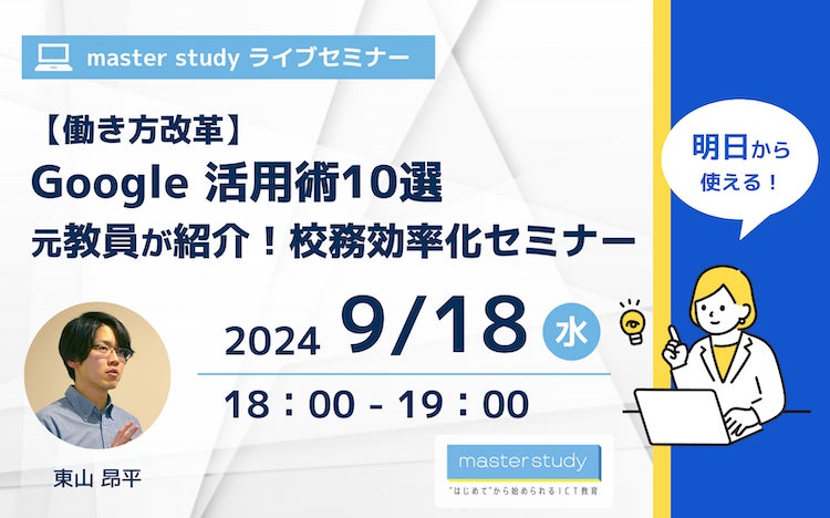 株式会社ストリートスマート(所在地:大阪府大阪市北区、代表取締役社長 松林 大輔)が運営する先生のための総合プラットフォーム「master study(マスタースタディ)」では、Google for Education™ の各種ツールの基本操作から、先生がいま知りたい最新トレンド情報まで、明日からすぐに使えるお役立ち情報をお伝えするオンラインセミナーを開催しています。