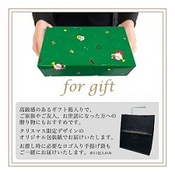 黒と金を基調としたギフトボックスに、クリスマス限定デザインの包装紙とロゴ入り手提げ袋(11包入のみ)付き。