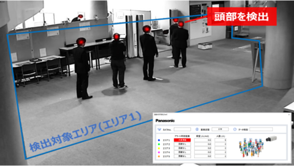「人密集度可視化ソリューション」を用いて、待機列付近に設置のネットワークカメラで撮影した画像から、喫煙所やトイレにおける待機列の混雑状況を計測し、かつリアルタイムに表示することで混雑回避を促します。