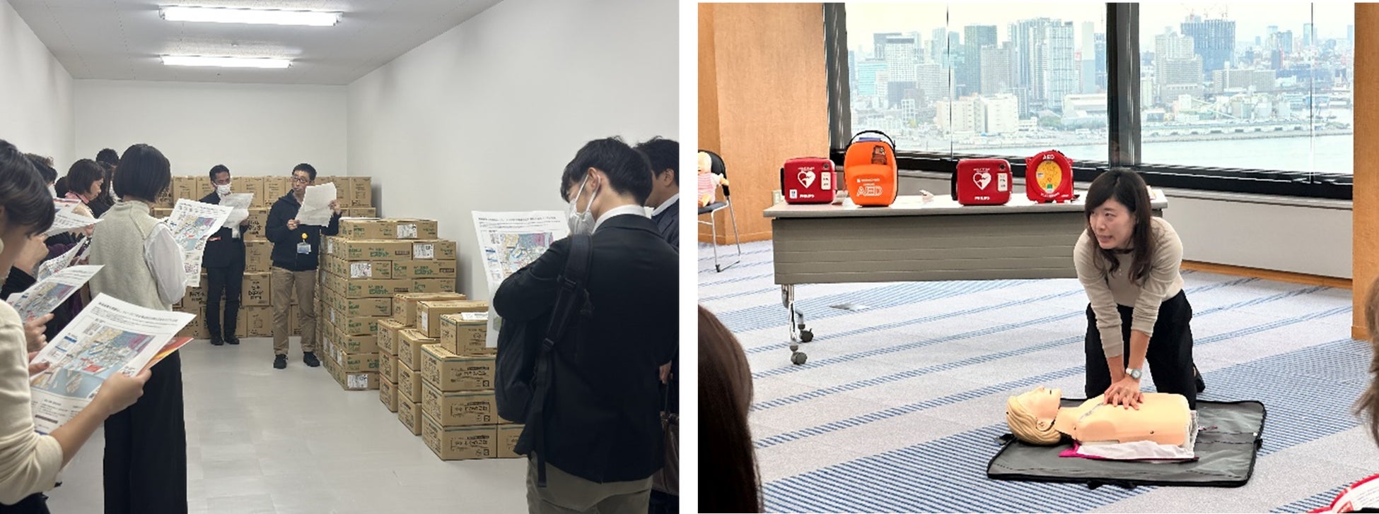 本イベントは、防災イベントを兼ね「AED講習会」およびトレードピアお台場における「備蓄倉庫ツアー」も実施しております。トレードピアお台場は、災害時に近隣の方々にも避難していただける一時避難所となっています。そのため、備蓄倉庫には、合計15,000食分の非常食を含む備蓄品を備えており、こちらの倉庫をご案内いたしました。