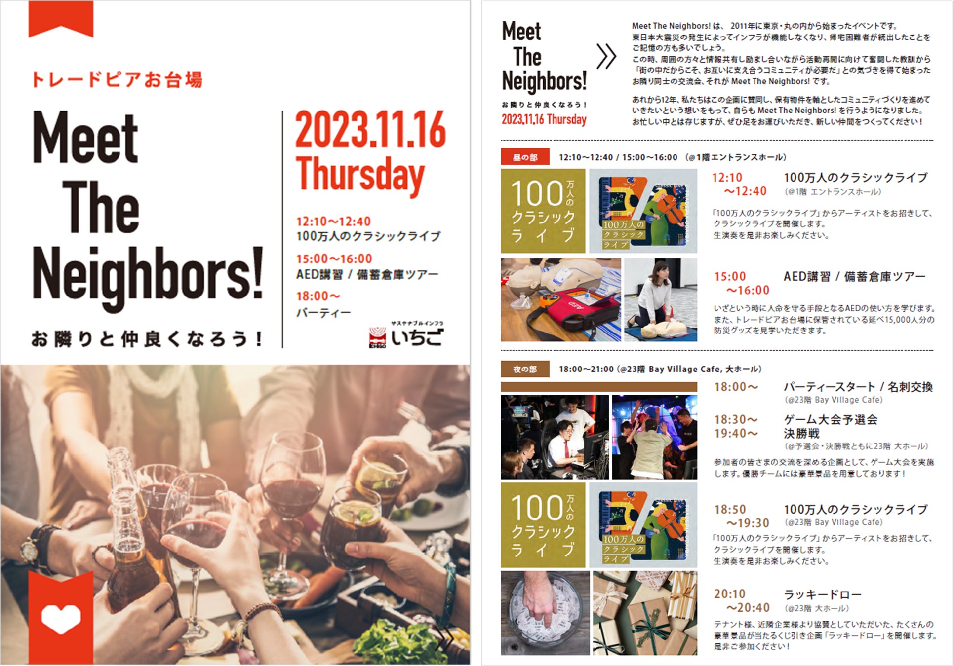 ⼼を込めて現存不動産に新しい価値を創造する、⼼築(しんちく)を軸とした事業モデルを展開しています。いちごが保有する大規模オフィスビル「トレードピアお台場」にて、テナント様や近隣の皆さまをつなぐ「お隣り同士の交流会」として、Meet The Neighbors!というイベントを2023年11月16日に開催しました。