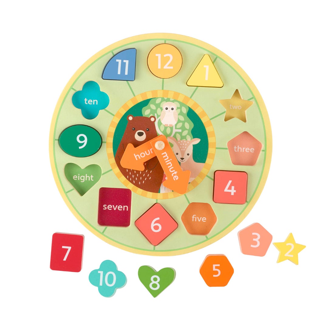 時計の形の型はめおもちゃ。ブロックで遊びながら、数字やカタチ、色について学べます。はじめは針をクルクルと動かして指先遊び、大きくなったら時間に関するクイズを楽しむことも。成長に合わせて長く活躍するおもちゃです。
