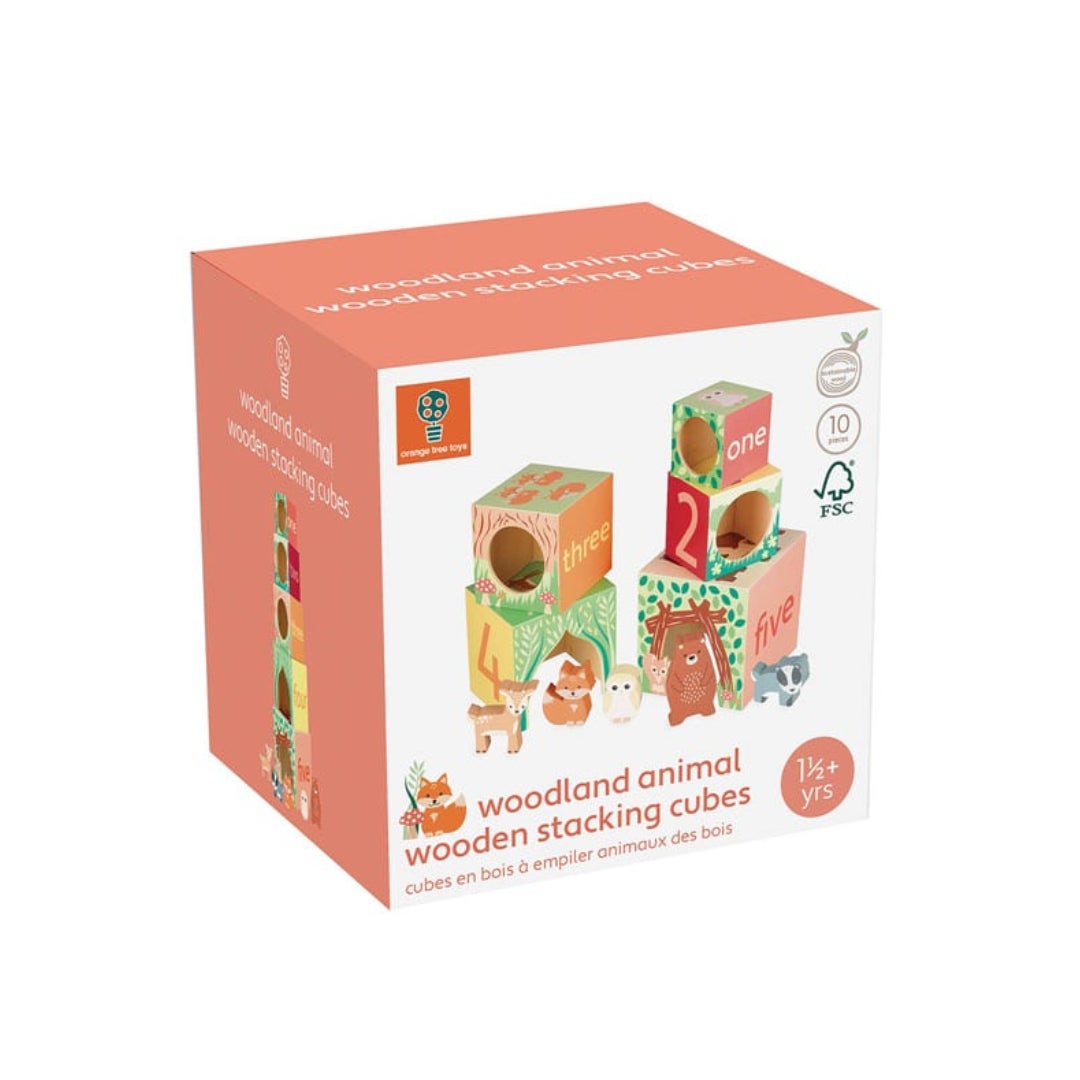 キューブを重ねたり、並べたり、どうぶつのおうちに見立ててごっこ遊びをしたりと、様々な楽しみ方が可能。5つのキューブには数字を楽しく学べるデザインが施されています。キューブは入れ子になっているので、コンパクトに収納できます。