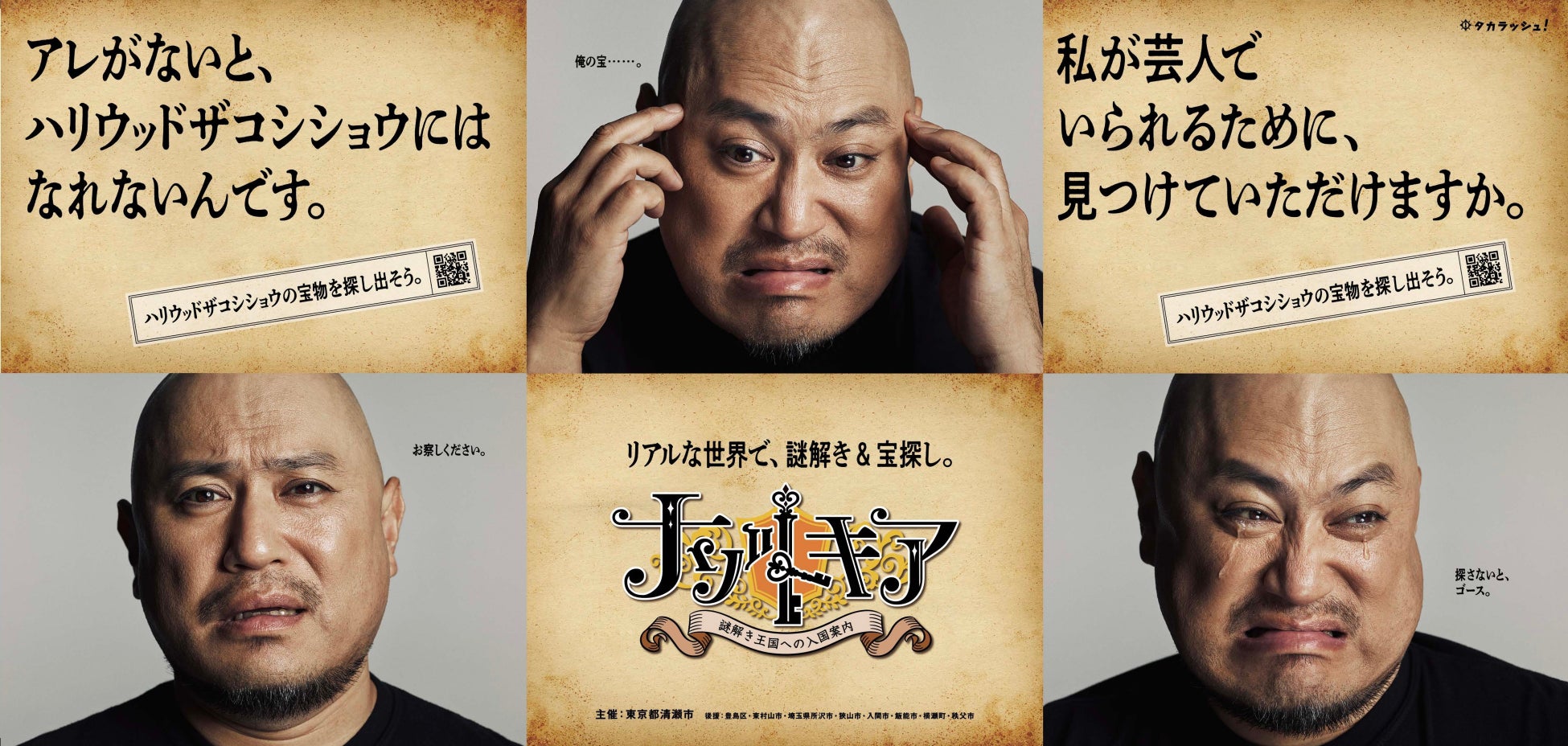 体験型コンテンツ「リアル宝探し」の企画・制作・運営を手がける株式会社タカラッシュ(本社:東京都品川区、代表取締役:齊藤 多可志)は、2024年11月1日より、東京都清瀬市の主催で、西武線沿線の9市区町広域連携による周遊型宝探しイベント『ナゾトキア〜謎解き王国への入国案内〜』を実施しています。今回、当イベントの追加クエストとして、12月16日(月)より、お笑い芸人のハリウッドザコシショウさんを起用した特別クエストイベントを実施いたします。またそれに合わせて、同じくハリウッドザコシショウさんを起用した交通広告と車体広告掲出、そしてWEB動画広告への配信がスタートされます。