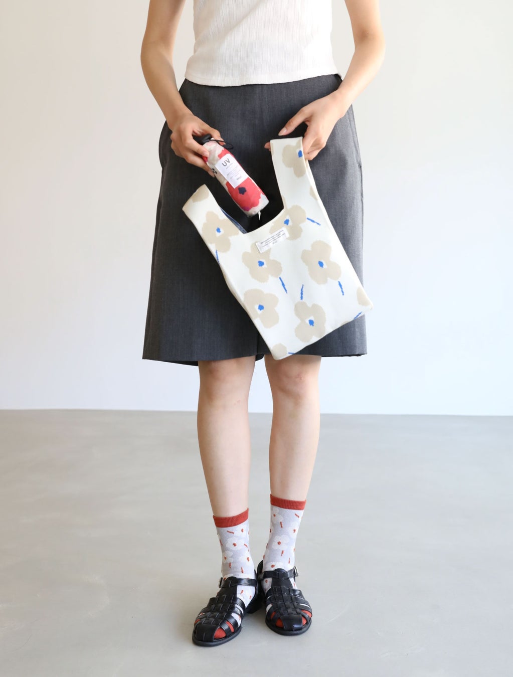 立体感のある編み模様が、花のかたちをふんわりと浮かび上がらせ、足元にさりげない存在感を添えます。