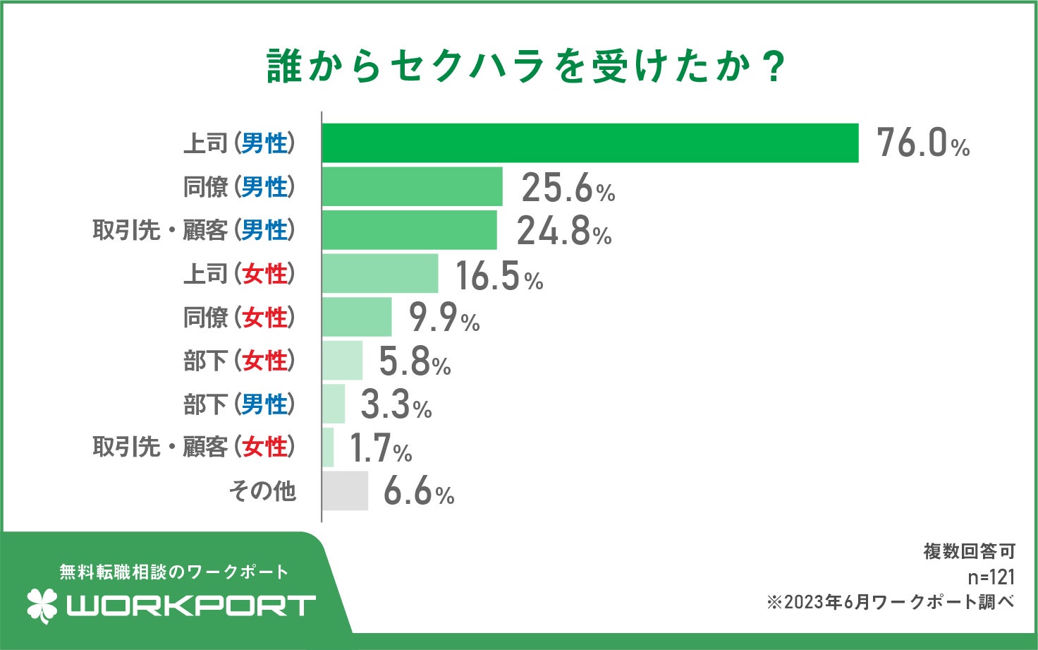 職場でセクハラを受けたことがあると回答した人に、誰からセクハラを受けたか聞いたところ、「上司(男性)」が76.0%で最多となりました。次いで、「同僚(男性)」が25.6%、「取引先・顧客(男性)」が24.8%と、どちらも30%近くにのぼる結果となりました。
