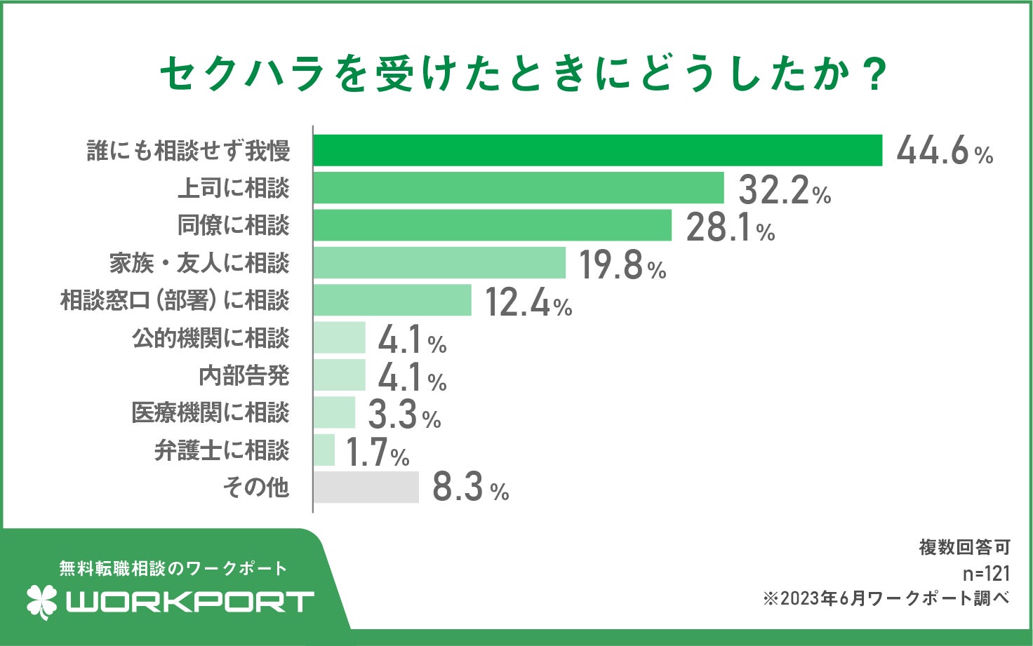 続いて、職場でセクハラを受けたことがあると回答した人に、セクハラを受けたときにどうしたか聞いたところ、「誰にも相談せず我慢した」が44.6%で最も多い結果となりました。次いで、「上司に相談」が32.2%、「同僚に相談」が28.1%でした。