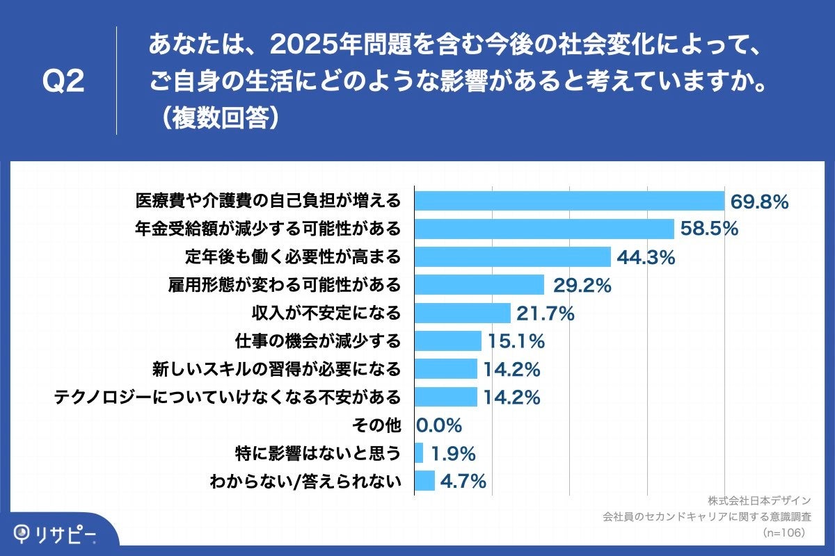 「Q2.あなたは、2025年問題を含む今後の社会変化によって、ご自身の生活にどのような影響があると考えていますか。(複数回答)」(n=106)と質問したところ、「医療費や介護費の自己負担が増える」が69.8%、「年金受給額が減少する可能性がある」が58.5%、「定年後も働く必要性が高まる」が44.3%という回答となりました。