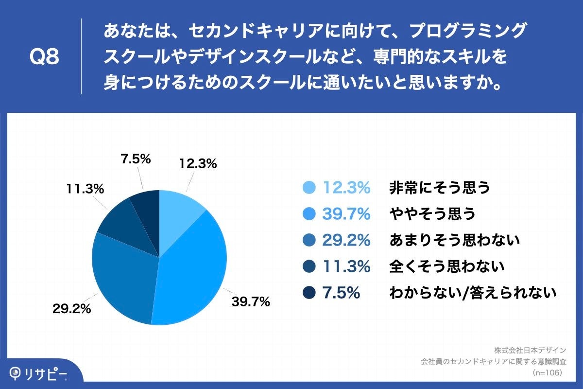 「Q8.あなたは、セカンドキャリアに向けて、プログラミングスクールやデザインスクールなど、専門的なスキルを身につけるためのスクールに通いたいと思いますか。」(n=106)と質問したところ、「非常にそう思う」が12.3%、「ややそう思う」が39.7%という回答となりました。