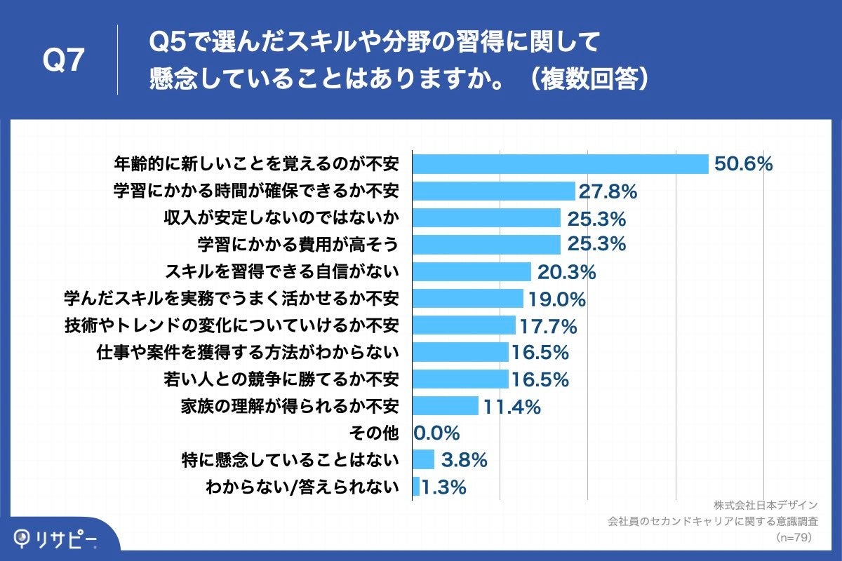 Q4で「わからない/答えられない」かつQ5で「特にない」「わからない/答えられない」以外を回答した方に、「Q7.Q5で選んだスキルや分野の習得に関して懸念していることはありますか。(複数回答)」(n=79)と質問したところ、「年齢的に新しいことを覚えるのが不安」が50.6%、「学習にかかる時間が確保できるか不安」が27.8%という回答となりました。
