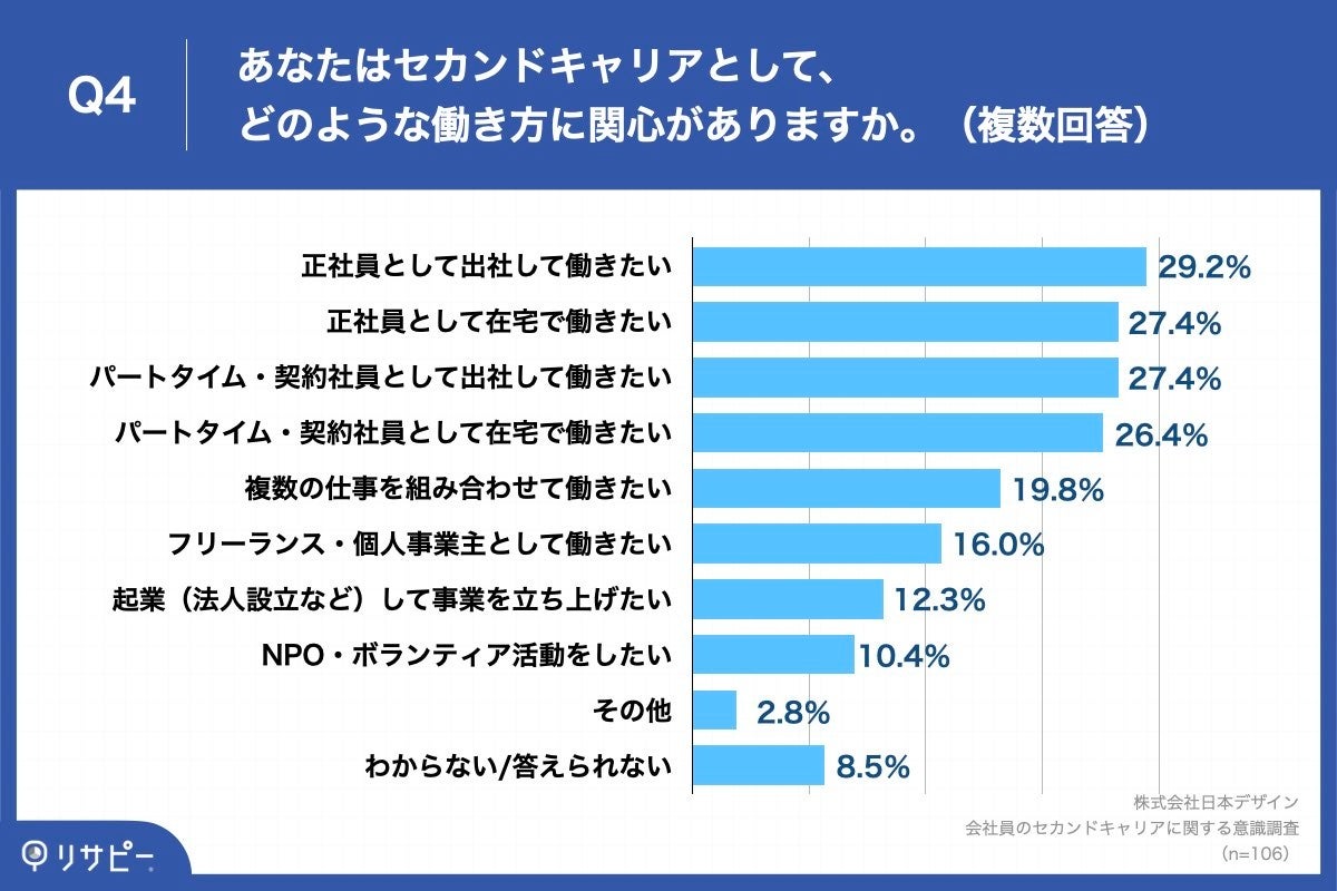 「Q4.あなたはセカンドキャリアとして、どのような働き方に関心がありますか。(複数回答)」(n=106)と質問したところ、「正社員として出社して働きたい」が29.2%、「正社員として在宅で働きたい」が27.4%、「パートタイム・契約社員として出社して働きたい」が27.4%という回答となりました。