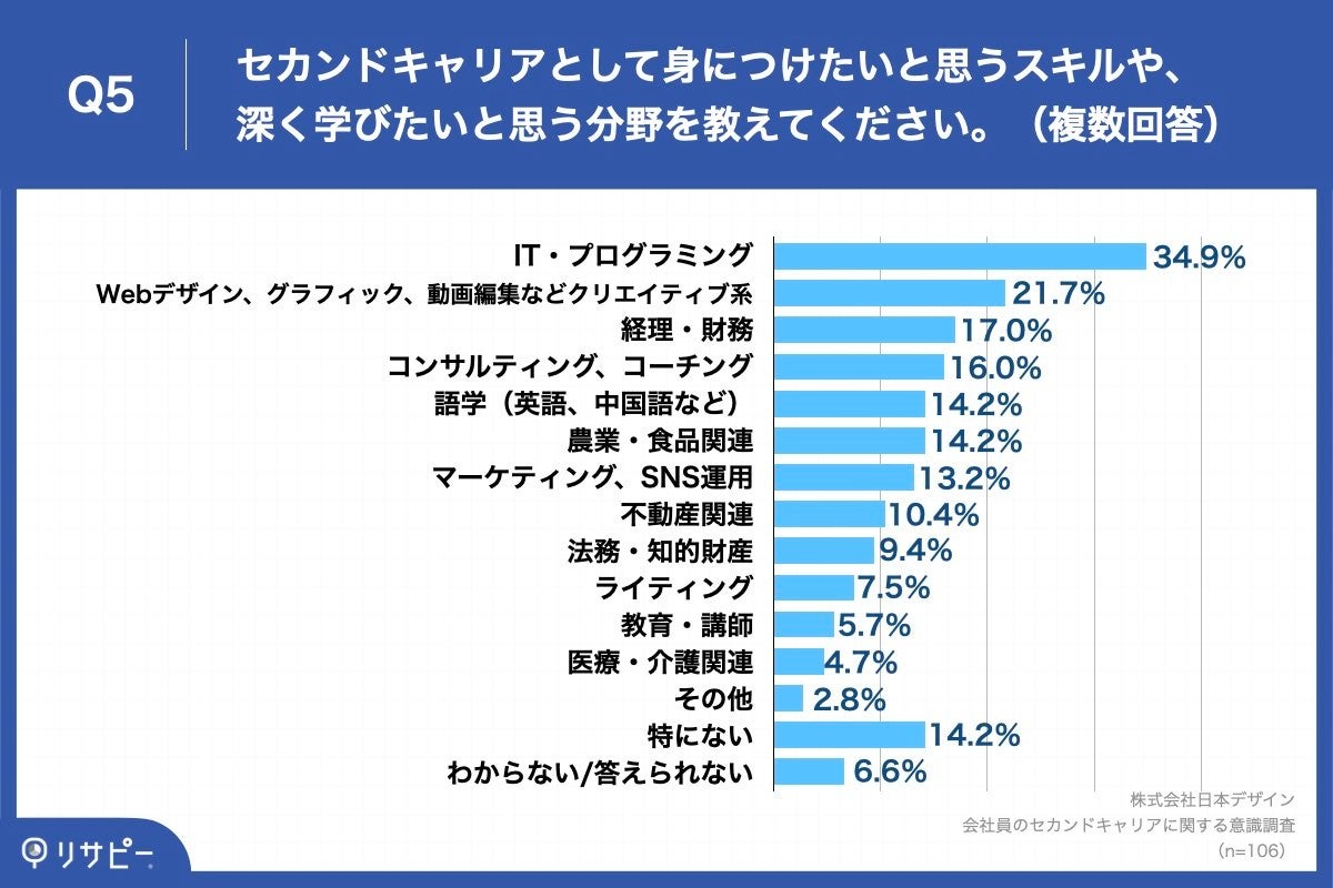 「Q5.セカンドキャリアとして身につけたいと思うスキルや、深く学びたいと思う分野を教えてください。(複数回答)」(n=106)と質問したところ、「IT・プログラミング」が34.9%、「Webデザイン、グラフィック、動画編集などクリエイティブ系」が21.7%、「経理・財務」が17.0%という回答となりました。