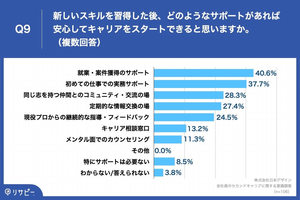 「Q9.新しいスキルを習得した後、どのようなサポートがあれば安心してキャリアをスタートできると思いますか。(複数回答)」(n=106)と質問したところ、「就業・案件獲得のサポート(クライアントとのマッチング含む)」が40.6%、「初めての仕事での実務サポート」が37.7%、「同じ志を持つ仲間とのコミュニティ・交流の場」が28.3%という回答となりました。