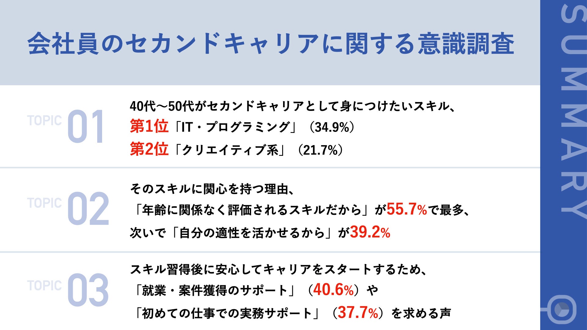 01|40代〜50代がセカンドキャリアとして身につけたいスキル、第1位「IT・プログラミング」(34.9%) 第2位「クリエイティブ系」(21.7%)