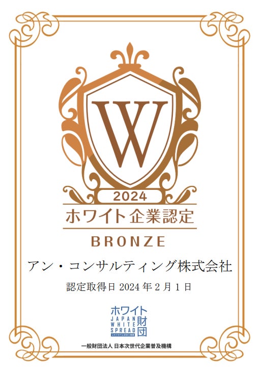 アン・コンサルティング株式会社様が、一般財団法人日本次世代企業普及機構(通称:ホワイト財団)が運営する「ホワイト企業認定 ブロンズランク」を取得しましたことをお知らせいたします。
