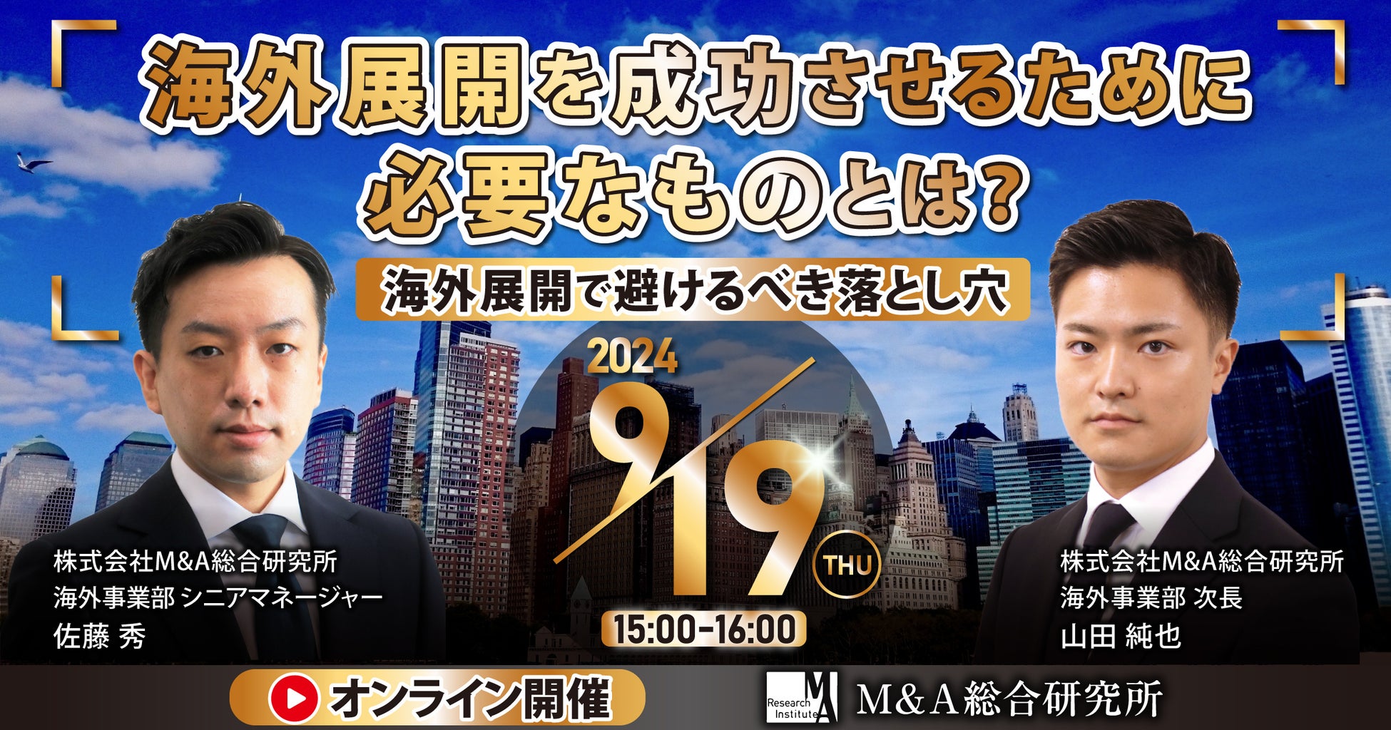 株式会社M&A総合研究所(本社:東京都千代田区、代表取締役社長:佐上 峻作、以下「当社」)は、2024年9月19日(木)にオンラインで海外M&Aに関するセミナーを実施いたします。