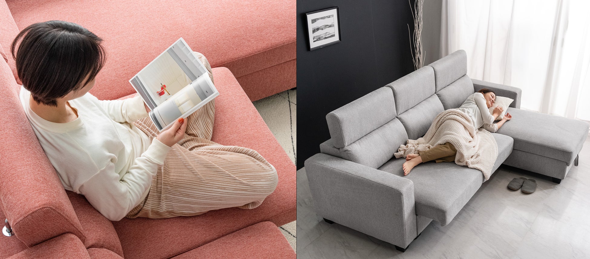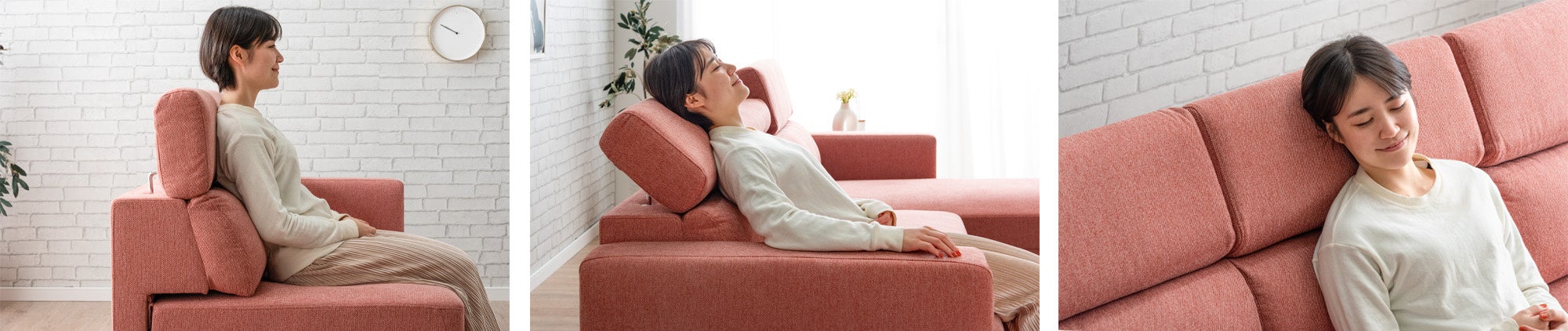 さらに食事やティータイムの際には座面を引き出さずに通常スタイルのソファとして使用でき、テーブルの上に置いている飲み物やスナックなどを手に取りながら、背もたれに寄りかかってゆったりとお過ごしいただけます。