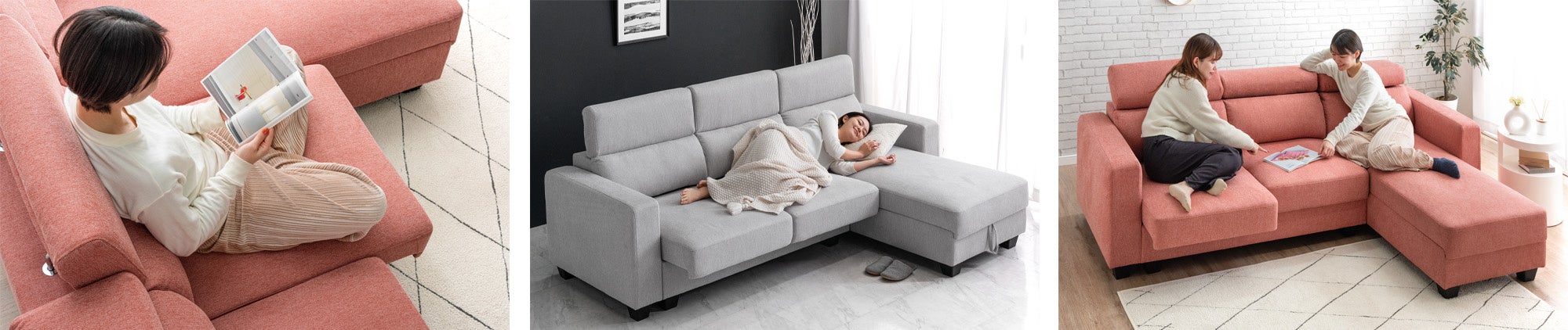 “欲張り多機能ソファ”はスライド座面に加えてヘッドリクライニングを調節することであぐらやごろ寝、横座りなど様々な姿勢に合わせてくつろぐことができるアイテムです。
