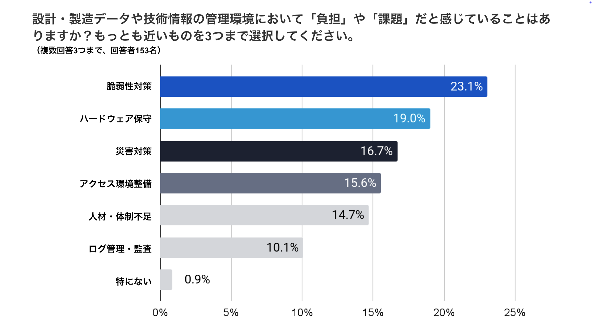 ・設計・製造データ等の管理における負担は「脆弱性対策(23.1%)」、次いで「ハードウェア保守(19.0%)」や「災害対策(16.7%)」が上位。既存システムの維持・保守業務が情報システム部門のリソースを圧迫しています。