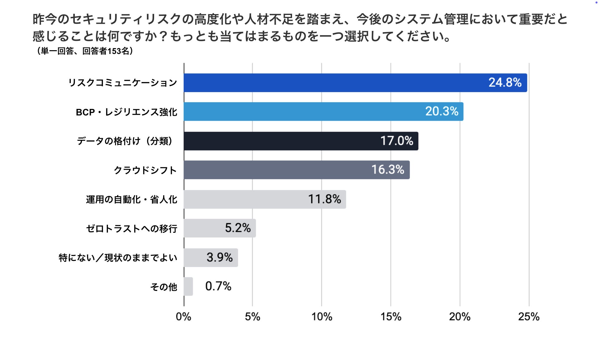 ・今後のシステム管理において、現場との対話でリスクの許容度を合意する「リスクコミュニケーション(24.8%)」が重要視されています。