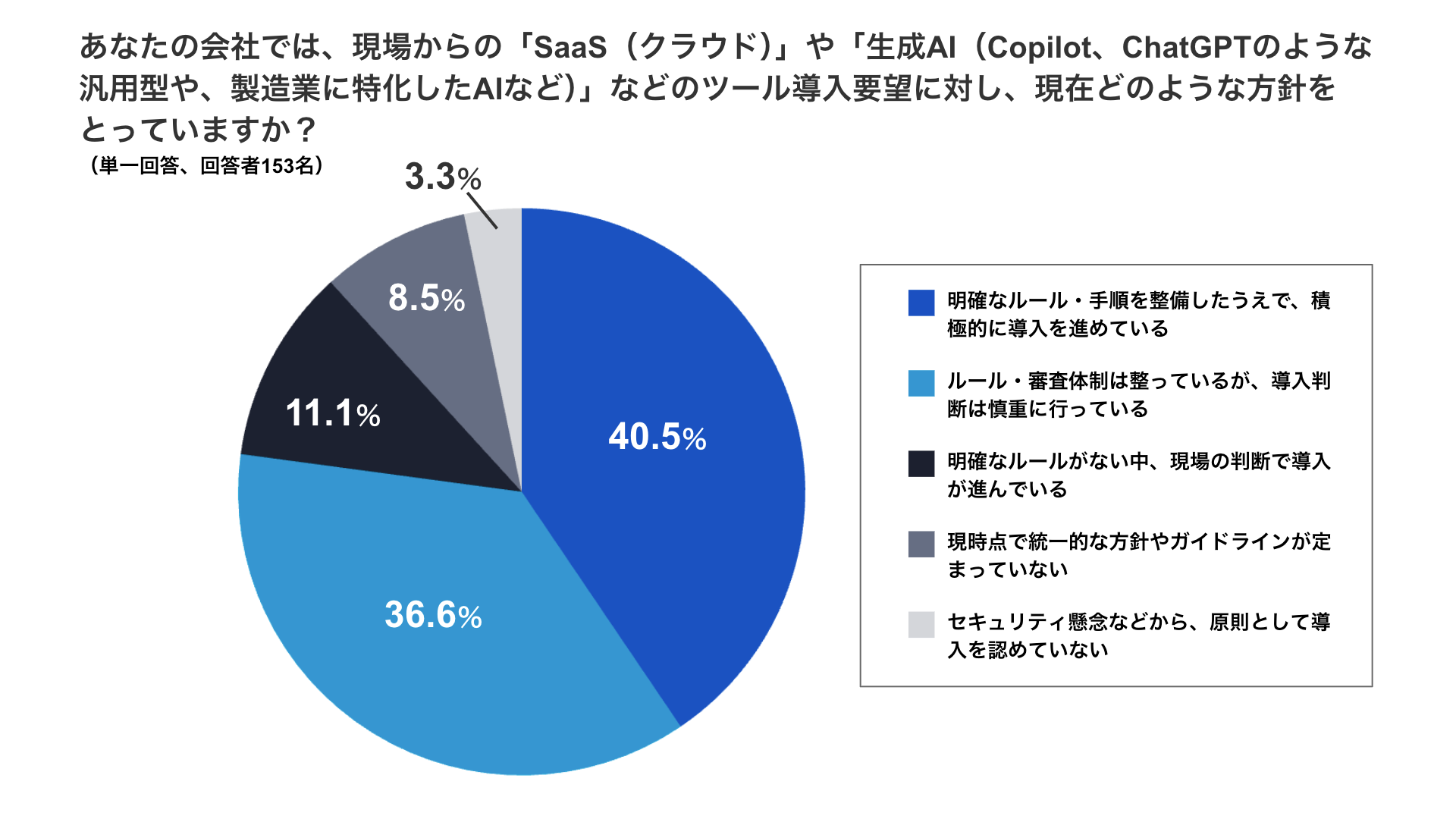 ・製造業の約8割がAI・SaaS導入のルール・手順を整備。一方で「積極導入(40.5%)」と「慎重判断(36.6%)」で二分され、体制構築と実運用のスピードに差が出ています。