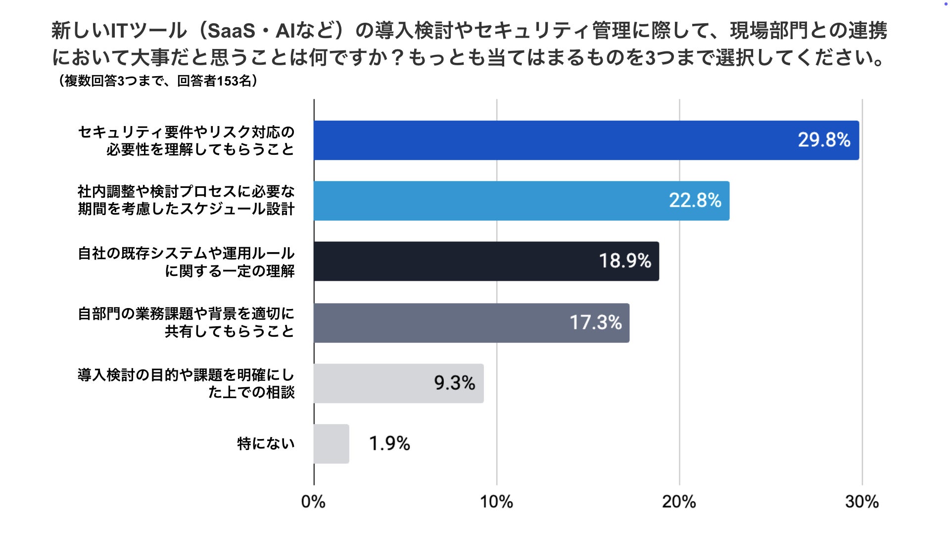 ・現場部門との連携で最も重要なのは「セキュリティ要件やリスク対応への理解(29.8%)」。