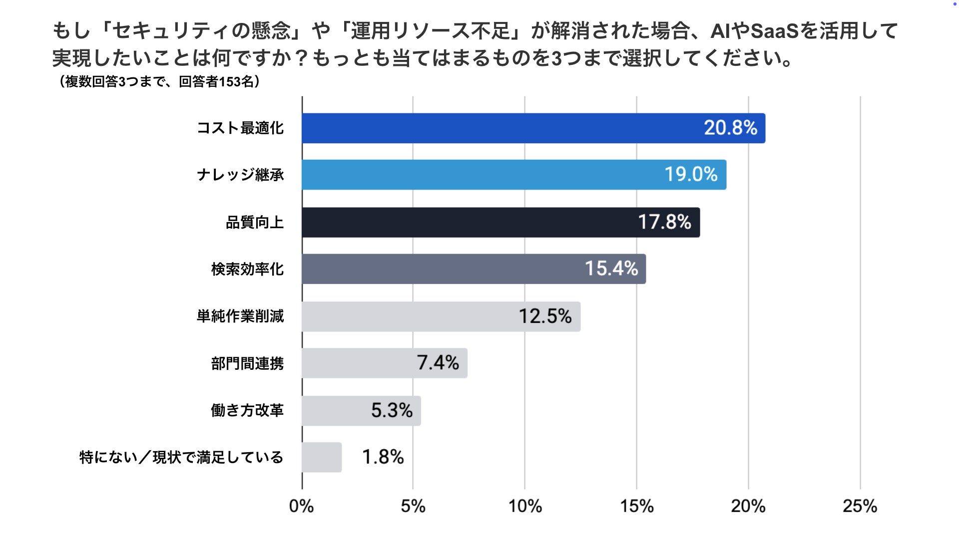 ● AI・SaaSで実現したいことは、「コスト最適化(20.8%)」「ナレッジ継承(19.0%)」「品質向上(17.8%)」がトップ3となりました。