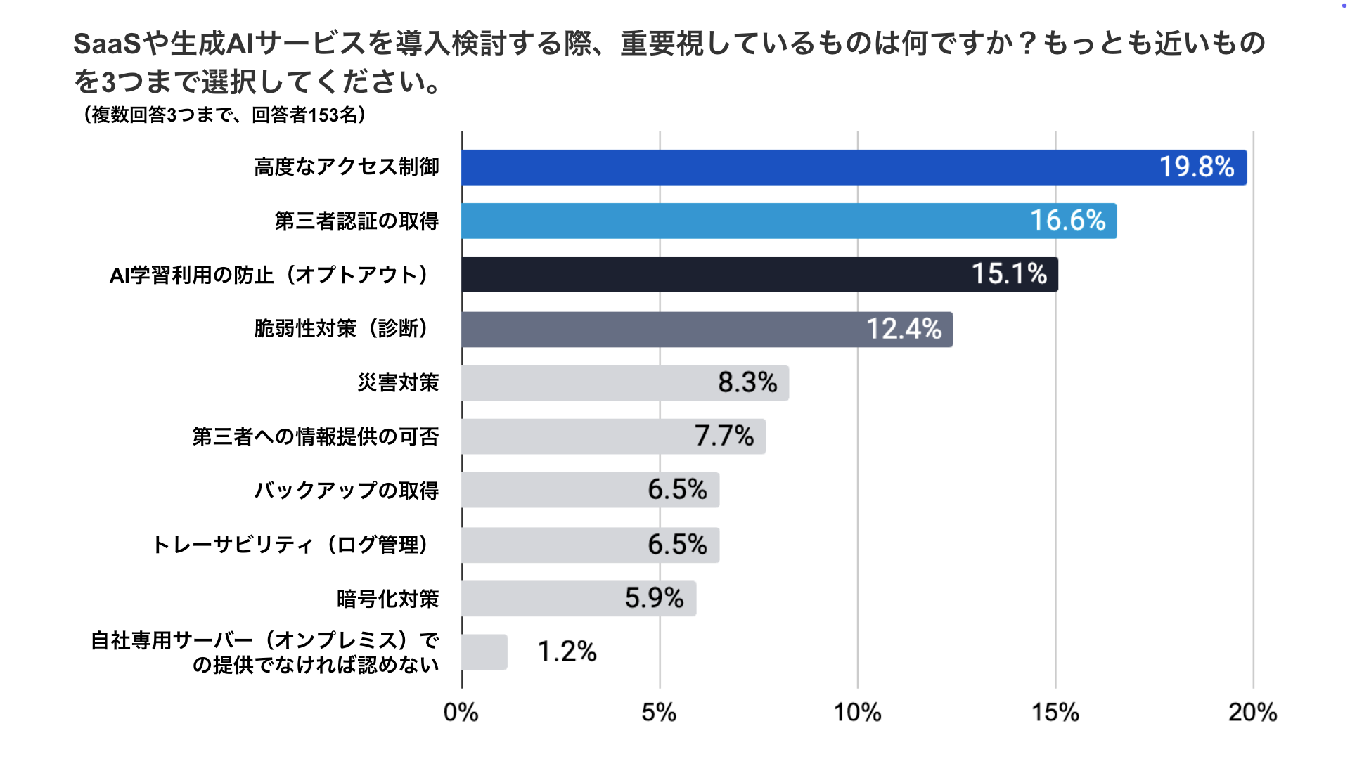 ・SaaSや生成AIサービス選定では「高度なアクセス制御(19.8%)」「第三者認証の取得(16.6%)」「AI学習利用の防止(15.1%)」を重視。