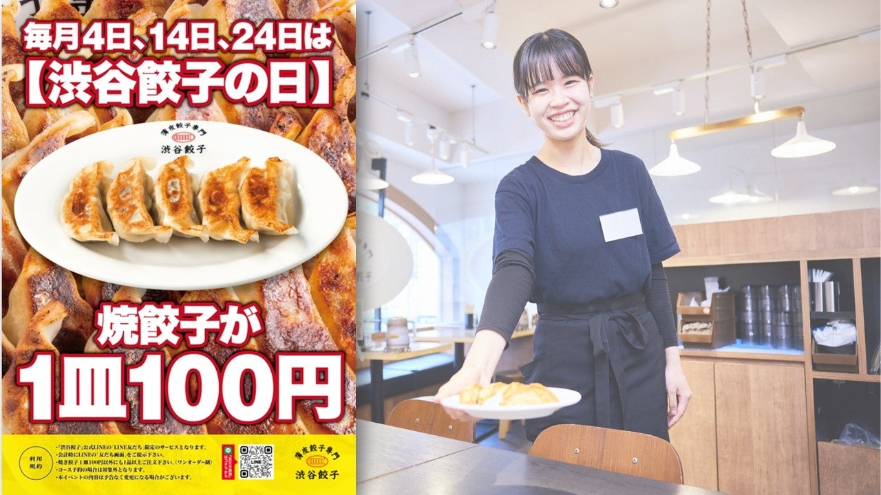 株式会社エムピーキッチンホールディングス(本社:東京都渋谷区 代表取締役会長:村上竹彦)が運営する『薄皮餃子専門 渋谷餃子』は、2025年より毎月「4がつく日(4日、14日、24日)」に、公式LINE登録者限定の特別キャンペーン「渋谷餃子の日」を実施することを発表します。このキャンペーンでは、LINE登録者に対して、100円(税込)で焼き餃子1皿を提供いたします。