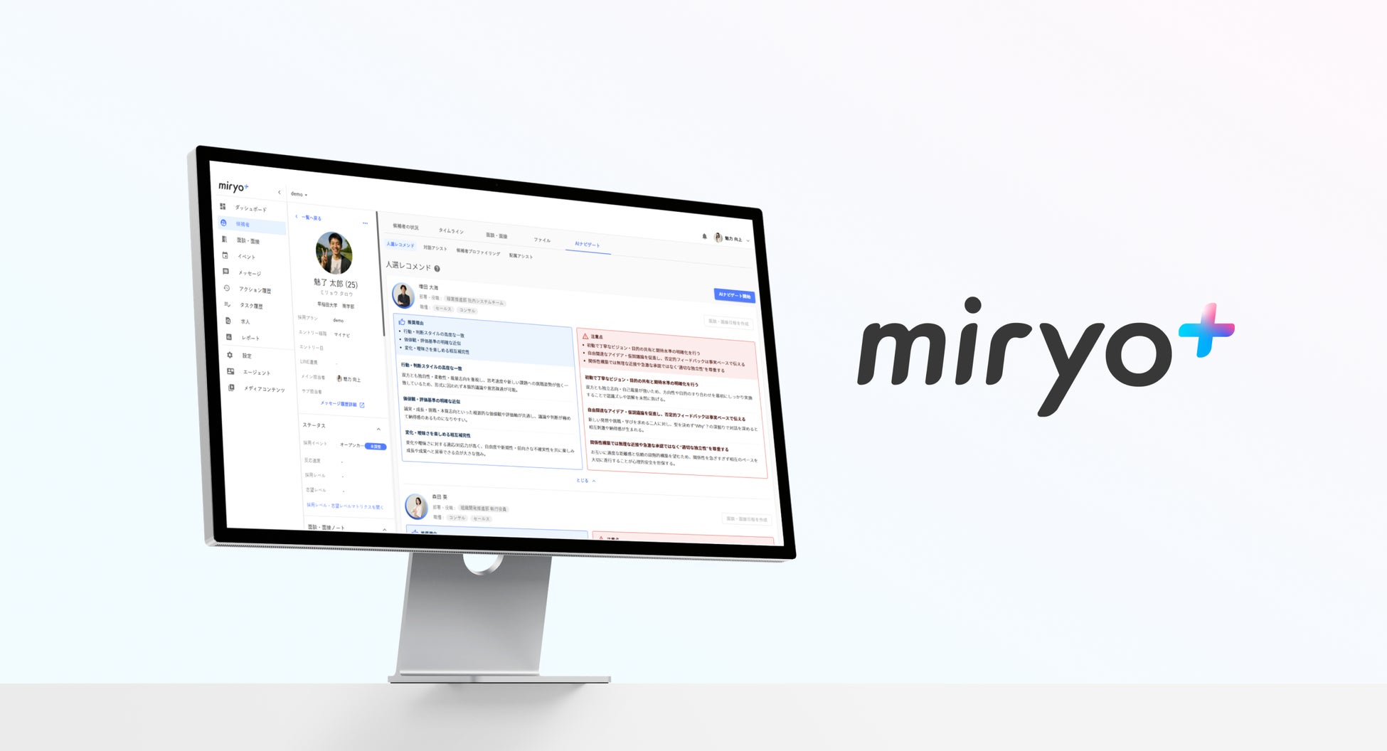 『miryo⁺』はレガシードが提供する、採用から配置・育成など人の活躍を支援し、人材活用を統合的にナビゲートするシステムです。採用業務の効率化だけでなく、候補者に 「この会社に入社したい、ここで働きたい」と思ってもらうための“魅了づけ”を強化することを目的とし、2022年4月に提供を開始しました。レガシードが創業以来10年間に渡り蓄積してきた採用・育成・組織づくりのノウハウをシステム化した、採用やマネジメントの現場に眠る感覚的、属人的、暗黙的な課題を解消できるこれまでにないサービスです。