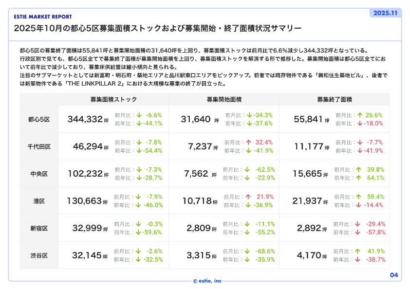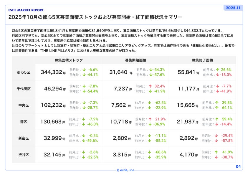 2025年10月の都心5区全体では、募集開始面積は前月比34.3%減の31,640坪、募集終了面積は前月比26.6%増の55,841坪となり、募集終了面積が募集開始面積を上回りました。募集面積ストックは前月比6.6%減の344,332坪となりました。